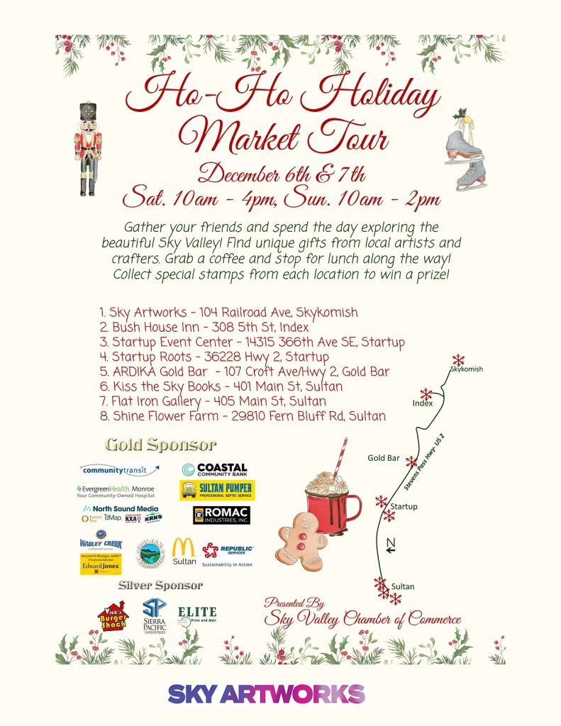 The HoHoHoliday Market is a valley-wide celebration of local creativity and festive spirit! Multiple venues across the Sky Valley open their doors for holiday shopping, each offering unique vendors, handcrafted gifts, and seasonal treats.