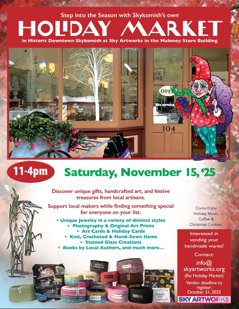 Step into the season at Skykomish’s Holiday Market! Discover unique gifts, handcrafted art, and festive treasures from local vendors. This is the perfect opportunity to support local makers while finding something special for everyone on your list.