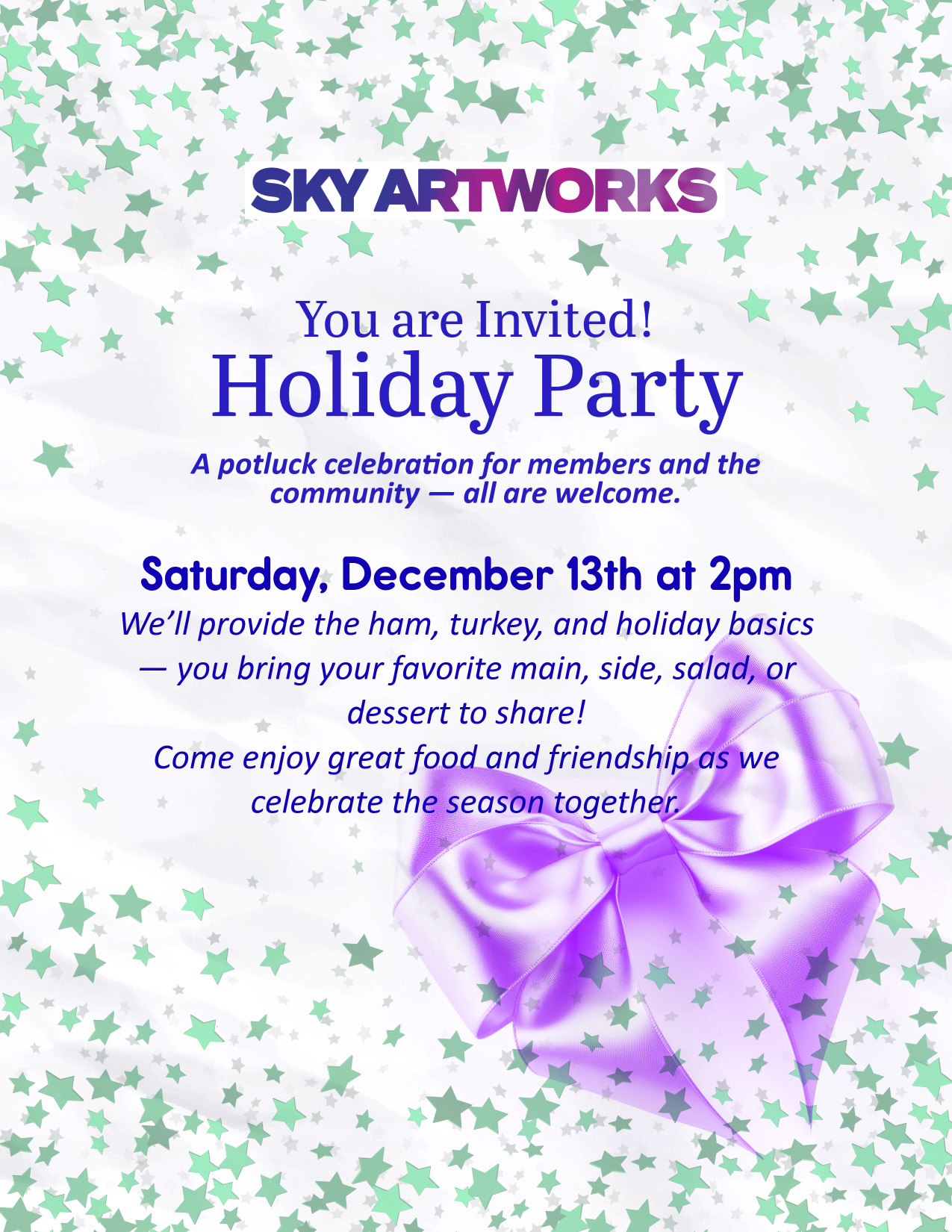 Join us for an afternoon of joy, laughter, and community connection! This annual potluck celebration brings together SkyArtworks members, friends, and neighbors for a cozy gathering filled with delicious food, festive music, and holiday cheer.